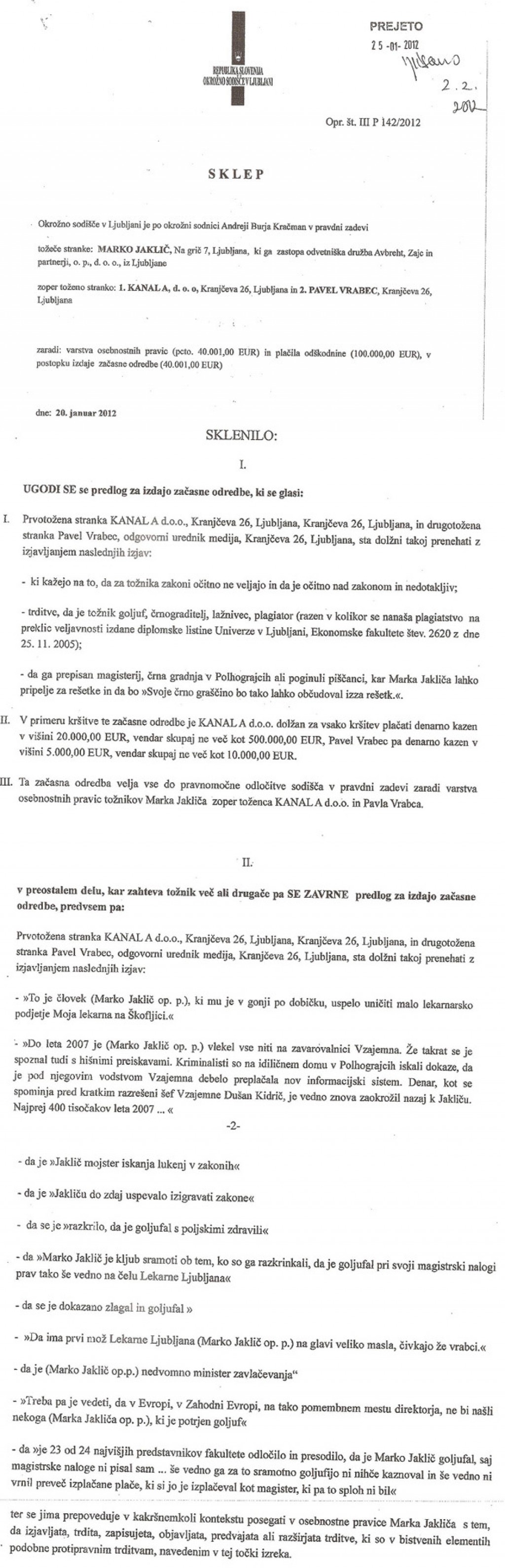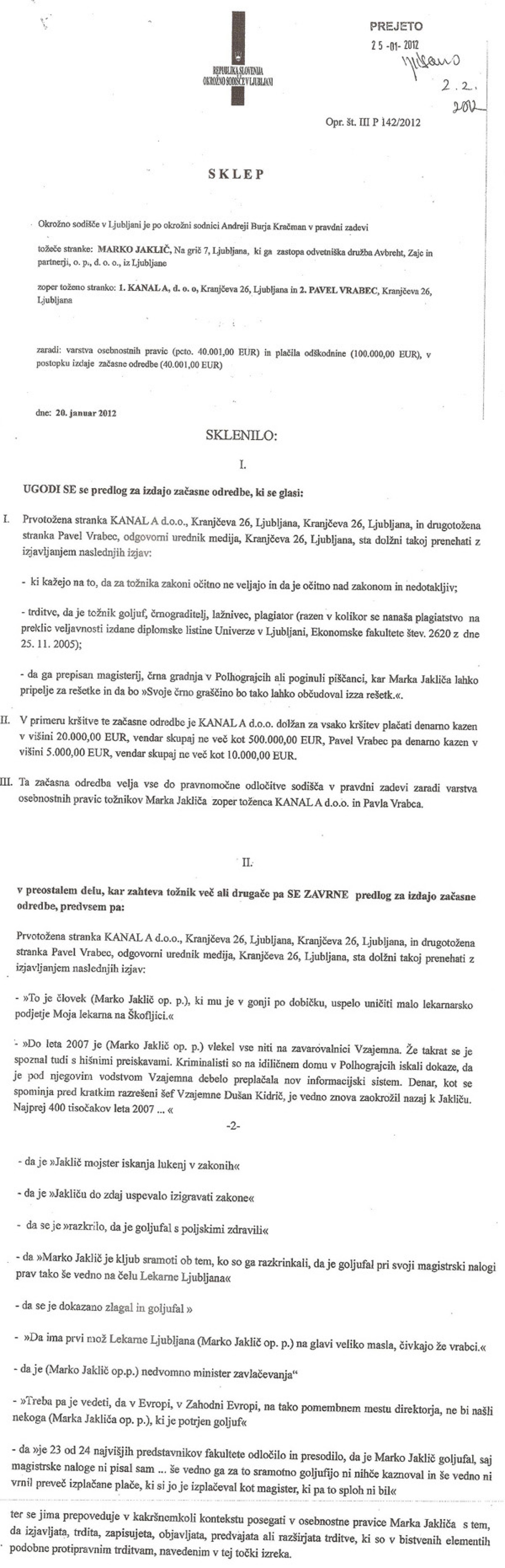 Prve tri strani začasne odredbe v tožbi Marka Jakliča proti Kanalu A in Pavletu Vrabcu, ko jo je izdala okrožna sodnica Andreja Burja Kračman.