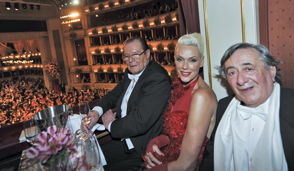 ... posebna VIP gosta letošnjega plesa pa sta bila Roger Moore, znan kot nekdanji filmski James Bond, in danska filmska igralka Birgit Nielsen. Na sliki desno je organizator Opernballa Richard Lugner.