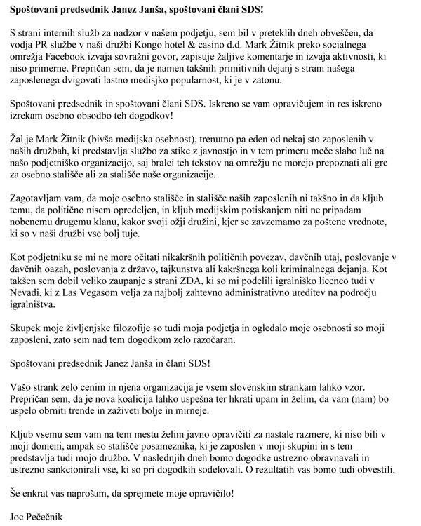 Javno pismo in opravičilo Joca Pečečnika, ki ga je naslovil na Janeza Janšo in SDS.