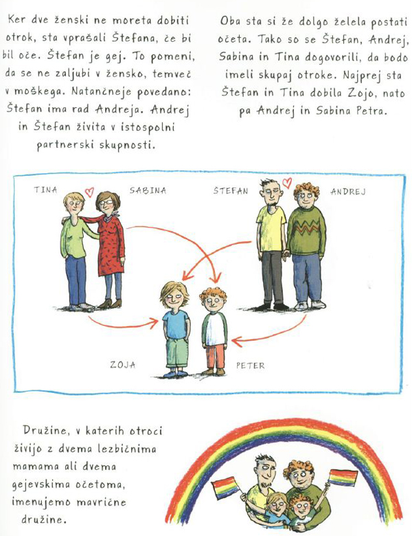 Odlomek iz slikanice Vse naše družine! Otroci naj bi si tako lažje ustvarili jasno sliko o družinskih vezeh, ki so lahko vezane na biološko ali socialno sorodstvo.