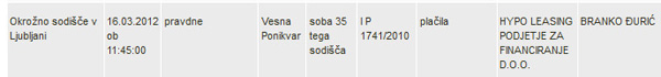 Obravnava v pravdni zadevi Hypo Leasing proti Branku Đuriću (IP 1741/2010), zaradi plačila je razpisana za petek, 16.3., ob 11.45, v stavbi ljubljanskega okrožnega sodišča, soba 35.