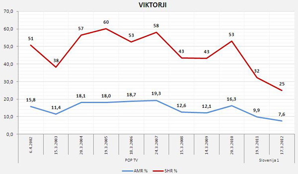Gledanost viktorjev od leta 2002 do 2012. Minulo soboto so zabeležili najslabšo gledanost doslej (za povečavo klikni na sliko).