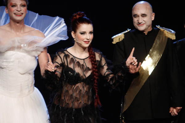 Maja Keuc po sinočnji predstavi, v družbi soigralcev Nenada Tokaliča in Petra Boštjančiča.