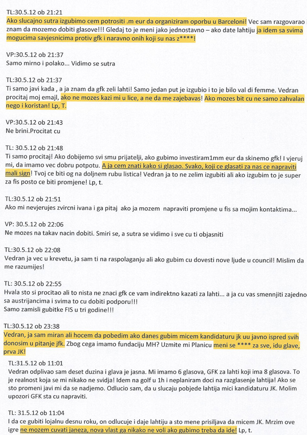 Celotna korespondenca med Tomažem Lovšetom in Vedranon Pavlekom, minulo sredo, 30. junija, dan pred odločilnim glasovanjem v Kangvonu. Izvlečene rumeno pobarvane stavke je danes na svoji spletni strani objavilo Delo.