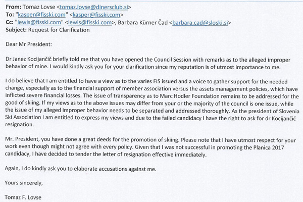 ... Tomaž Lovše pa trdi, da vodilnemu funkcionarju Mednarodne smučarske zveze sploh ni pošiljal nobenih elektronskih sporočil, razen tega e-maila po koncu glasovanja na kongresu v Kangvonu.