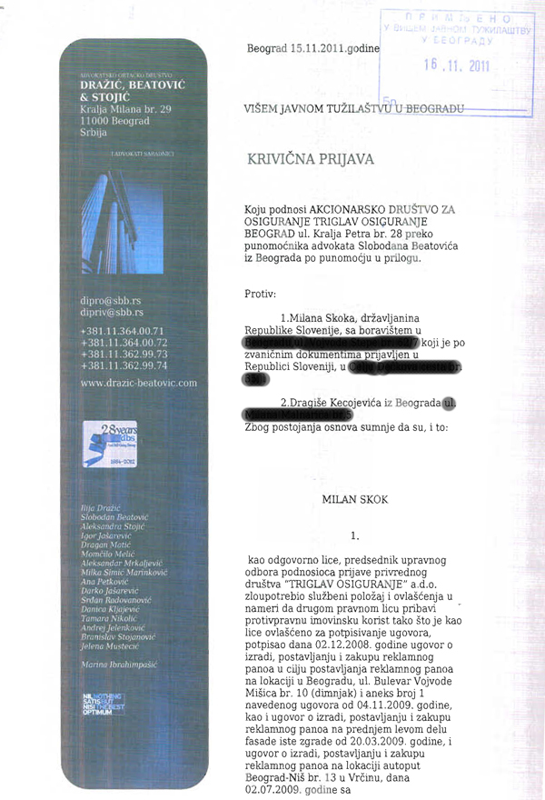 Kazenska prijava zoper Milana Skoka in Dragišo Kecojevića je bila vložena 21. novembra 2011.