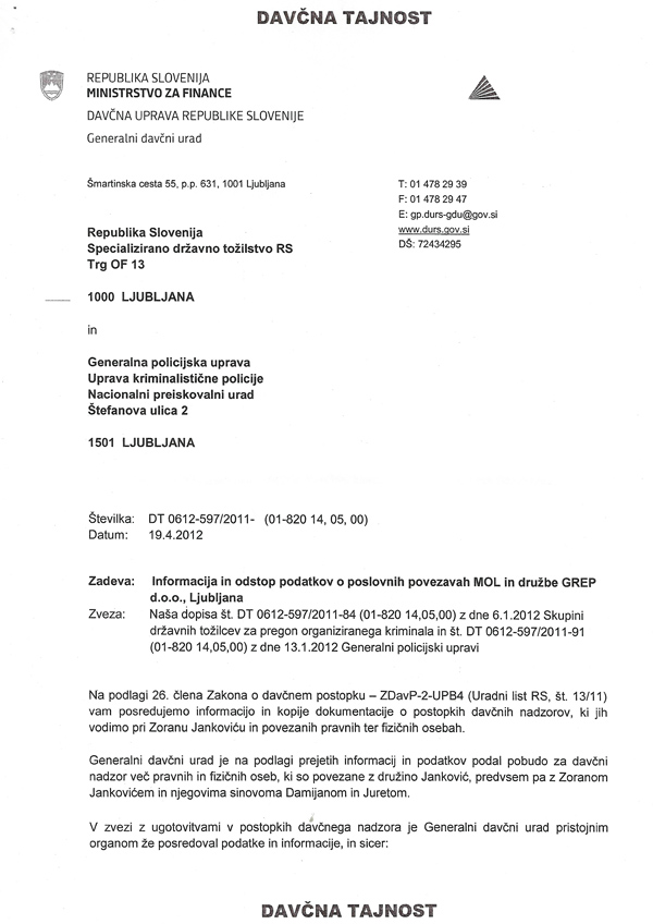 Faksimile dokumentacije Dursa, ki ga je davčna uprava poslala državnemu tožilstvu, vodstvu policije in Nacionalnemu preiskovalnemu uradu (za povečavo klikni na sliko).