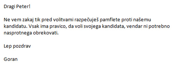 ... tukaj pa odgovor prejemnika pisma Gorana, ki je Žnidaršičevo pismo ocenil kot obrekljivo, Česnika pa vprašal, zakaj pamflet proti Pahorju pošilja naokoli tik pred volitvami.