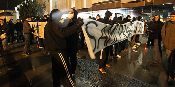 Desni ekstremisti so nosili kapuce in kirurške maske, levi pa kapuce in šale.