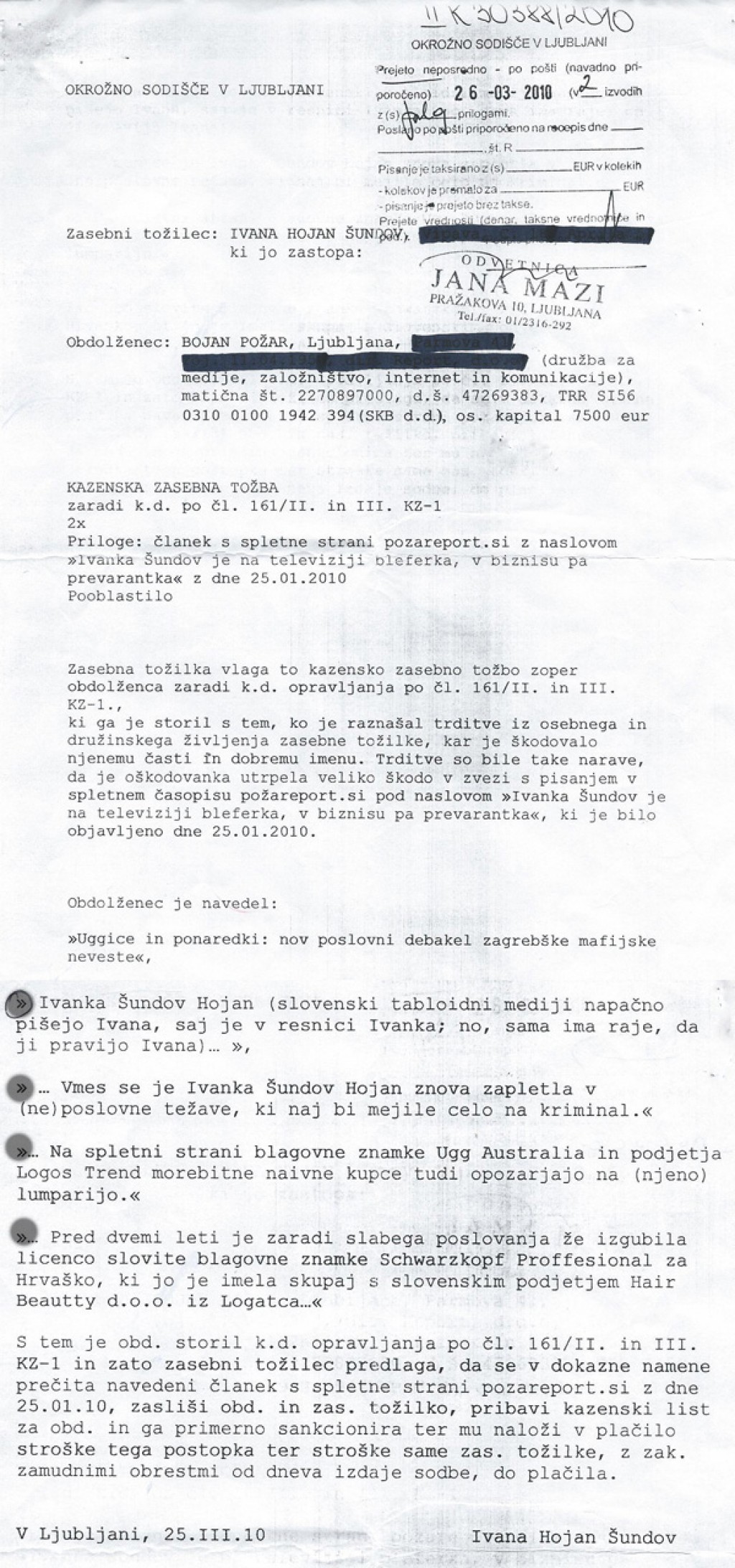Famozna kazenska tožba Ivane Šundov Hojan, ki jo je marca 2010 na sodišče vložila odvetnica Jana Mazi. Očitki kaznivega dejanja so spisani ter kakor argumentirani v zadnjih štirih alinejah.