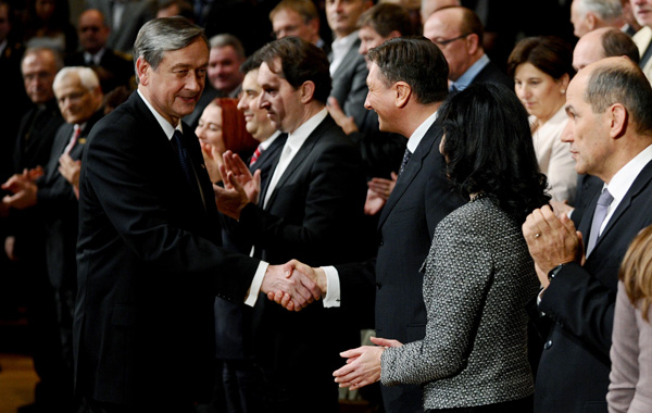 ... in pred začetkom sinočnje proslave od dnevu samostojnosti in enotnosti v Cankarjevem domu. Na minimalističnem sprejemu po koncu proslave, brez banketa, pa Türka ni bilo več videti.