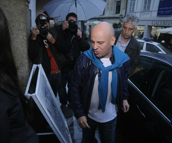 Damijan Janković med včerajšnjo policijsko preiskavo. Njegova spremljevalka Ursula Gawish pa je ravno včeraj rodila njuno hčerko.