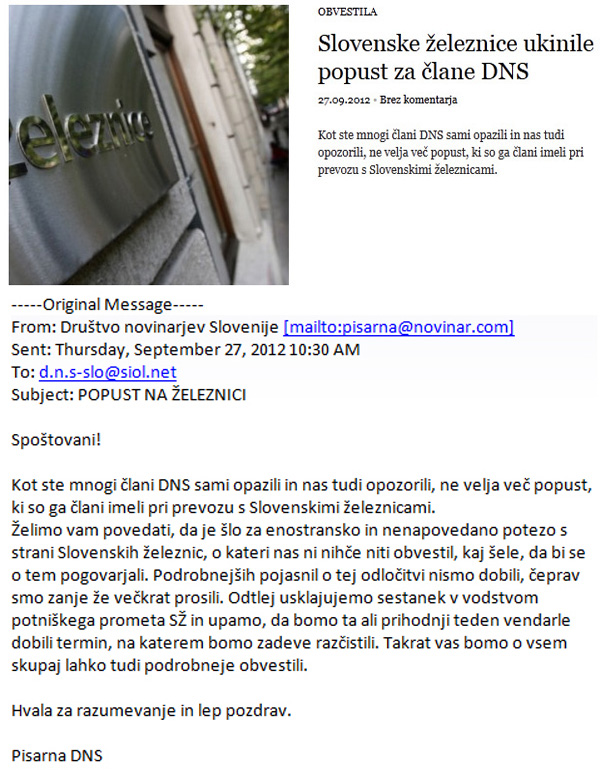 Društvo novinarjev Slovenije o famozni izgubi popustov na Slovenskih železnicah ...