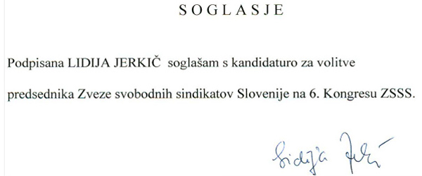 Lidija Jerkič je takole podpisala kandidaturo za predsednico Zveze sindikatov Slovenije.