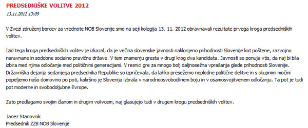 Sporočilo predzadnje seje kolegije predsednika Zveze borcev, ki ga je podpisal Janez Stanovnik. Novega posebnega sporočila tik pred drugim krogom predsedniških volitev pa ne bo (za povečavo klikni na sliko) ...