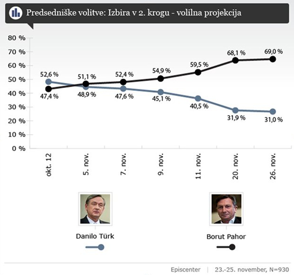Borut Pahor pred Danilom Türkom v finišu kampanje pred nedeljskim drugim krogom predsedniških volitev še dodatno povečuje prednost. Vir: Planet TV