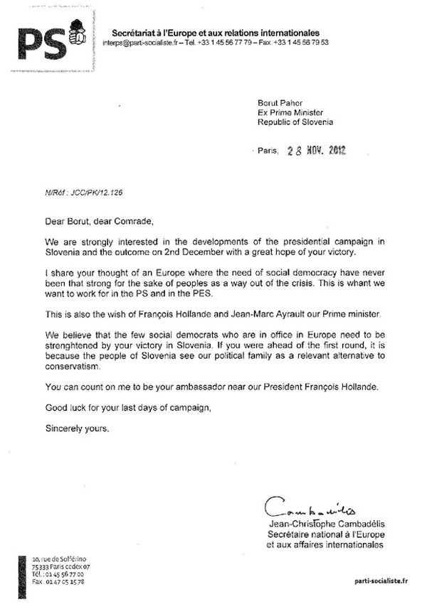 To je pismo francoskih socialistov, ki Borutu Pahorju sporočajo tudi podporo in dobre želje predsednika Francije Francoisa Hollanda. Mimogrede, za Hollandovo podporo pa je neuspešno lobiral Danilo Türk (za povečavo klikni na sliko).