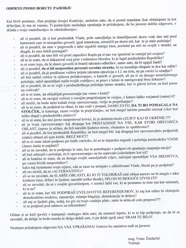 Faksimile odprtega pisma Borutu Pahorju, ki ga je podpisal magister Franc Žnidaršič iz Trebnjega (za povečavo klikni na sliko).