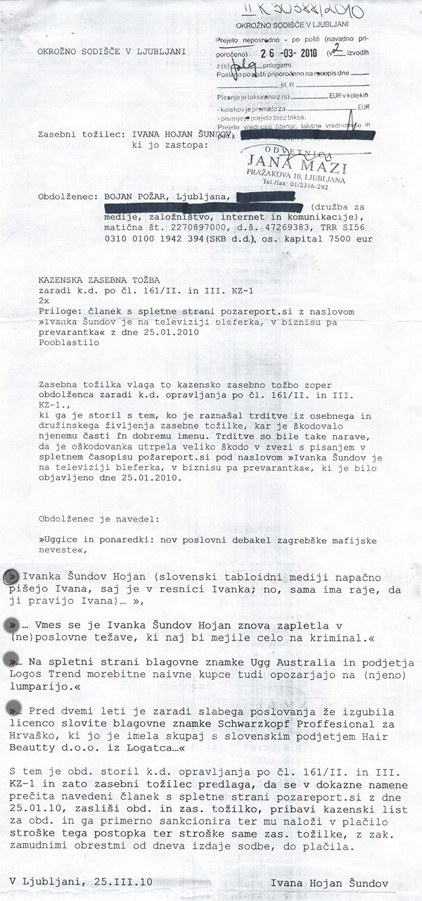 Famozna kazenska tožba Ivane Šundov Hojan, ki jo je marca 2010 na sodišče vložila odvetnica Jana Mazi. Očitki kaznivega dejanja so spisani ter kakor argumentirani v zadnjih štirih alinejah.