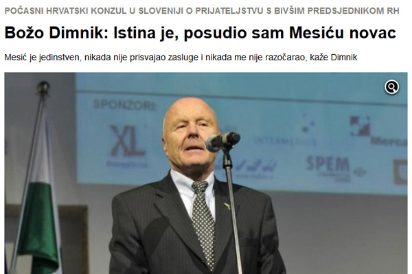 Božo Dimnik bi za Stipeta Mesića naredil vse, he, he, he... Seveda, če to ne bi nič stalo. Sta pa z Mesićem "hitro" ugotovila, da mu je Dimnik posodil denar. Bi postavil retorično vprašanje: Kje je DURS, kje je NPU, kje so naši vrli tožilci, da malo proučijo pot teh famoznih "kreditov". Dimnik, ne se norčevat iz folka....